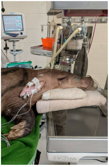 Aardvarks (Orycteropus afer) are large afrotherian mammals and the only extant member of the order Tubulidentata. They are native to sub-Saharan Africa, where they are considered a keystone species [1,2,3]. While uncommon, small numbers of aardvarks are maintained in zoological facilities, with only 33 individuals housed at American Zoological Association (AZA) accredited institutions across 20 institutions in the United States [4]. Literature regarding veterinary care of aardvarks is scarce [5,6,7,8,9,10], and thus management of the aardvark patient can be challenging for zoo practitioners.