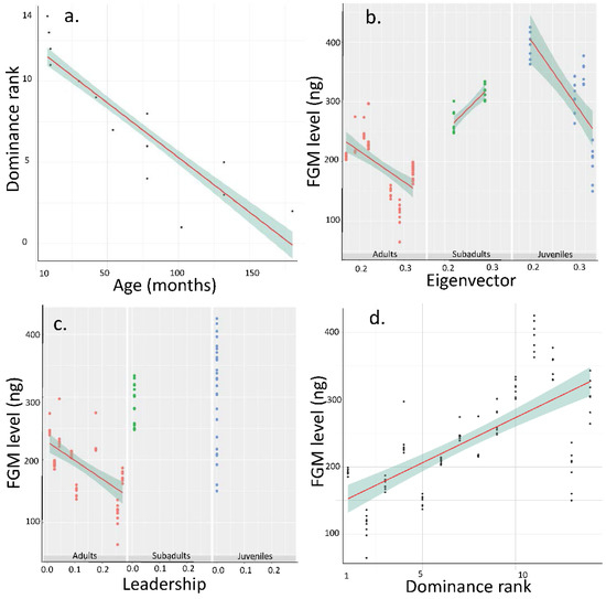 We used eigenvector centrality, leadership score and mean FGM concentrations per week during the observation period. Age and dominance rank were stable. Therefore, we could not implement individual identities as random factor in the next analyses as it was collinear with age and dominance rank (VIF > 4). Indeed, the potential collinearity between our predictor variables was tested by the calculation of variance inflation factor (VIF) from the R package car. In our different models (except Model 2, see below), age and dominance rank always showed a VIF > 4, meaning that they were highly correlated (adj r2 = 0.79, F = 388, p < 0.0001, Figure 1a). Therefore, we decided to remove dominance rank as variable in the models 1, 3 and 4 as it is dependent on age, which is also shown in previous studies [30,31,38,67] but we tested it in a separate model. Subsequently, multifactorial linear models (LM) were applied as follows: