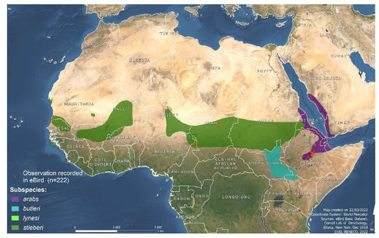 Distribution of Arabian bustards (Ardeotis arabs) subspecies. Red dots are observation events as recorded in eBird [19].