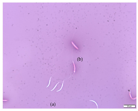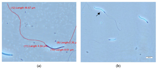 (a) Arabian bustard sperm measurements of the acrosome, head, midpiece and tail on cellSens image software, numbers between parentheses are generated by the software to count segments, and the length is represented in micrometers (version 1.12, Olympus cellSens Software); (b) Arabian bustard sperm showing a teratogenic defect (double-tail, highlighted by the arrow) and differences in sizes (Hancock solution fixation, wet chamber method, phase contrast 1000× oil, Olympus BX41).