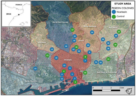 Nicarbazin has proven to be a successful method that is respectful towards animal welfare in controlling not only certain conflictive pigeon colonies in historical areas in Italy [5,10], Spain [11] and USA [9,12], but also Canadian geese (Branta canadensis; [13]). The present study reports the initial years’ experience of reducing the abundance of pigeons in the colonies that are associated with a higher ratio of conflict on a big-city-scale. The aim of this study is (1) to describe the three-year experience using a fertility control protocol based on nicarbazin, to reduce the abundance of the most conflictive colonies in the city of Barcelona, Spain, as well as to evaluate both (2) the effectiveness of the veterinary medicine (Ovistop®, ACME srl, Cavriago, RE, Italy) to reduce the abundance of pigeons and (3) the protocol used as a management strategy in an attempt to establish a long-term strategy to control a worldwide-spread species in the urban ecosystem while respecting animal welfare.