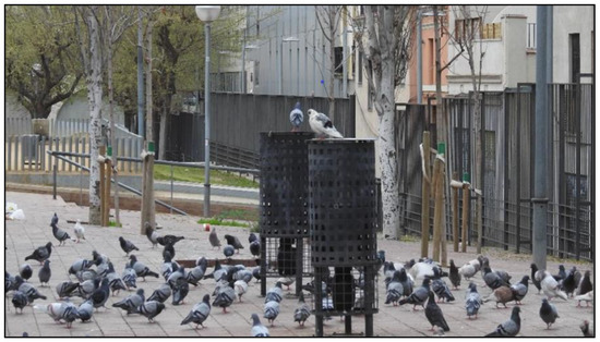 The treatment was supplied to the pigeons by means of an automatic hopper feeder (AHF, Figure 2) installed on public areas, such as streets and parks. The AHF had a capacity of 30 kg and was covered by a case assembling the design of the street bin furniture used in the city of Barcelona. The control unit activated the motor, administrating and dispersing the dose at approximately five meters around at the scheduled time. The technical capabilities of the AHF allowed for the administration of a maximum dose for 110 pigeons. Several PCs in the study were high-density colonies with an abundance ranging from 120–220 individuals; therefore, two AHFs were installed in these locations to administer the recommended dose.