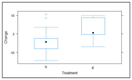 Percentage difference (change), between the 2017 pre-treatment and post-treatment periods, according to the treatment group, test (N, nicarbazin) and control (C)).