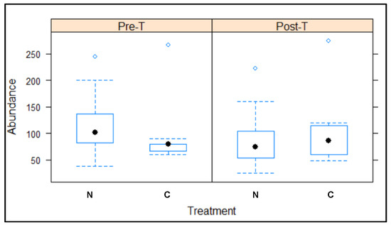 Differences in the average abundance of pigeons in each colony included as test (N, nicarbazin) and control (C) groups between the 2017 pre-treatment (Pre-T) and post-treatment (Post-T) periods.