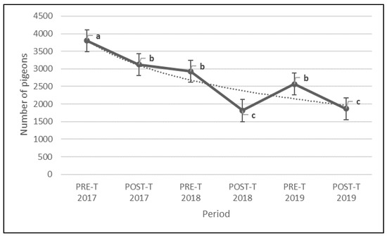 However, an increasing trend was registered during the 2018–2019 non-breeding period (Table 1 and Table 3), where the pigeon population increased by 29.93% on average (757 pigeons). As a result, the findings of the analysis of the population trends between pre-treatment or post-treatment periods among years (Table 1 and Table 3) showed a significant decreasing trend for 2017–2018 and 2017–2019 in both pre-treatment (2017–2018, −27.41%, −872 pigeons; 2017–2019, −29.1%, −1230 pigeons) and post-treatment (2017-2018, −37.59%, −1308 pigeons; 2017–2019, −33.82%, −1257 pigeon) periods, but not for the 2018–2019 pre-treatment and post-treatment periods.
