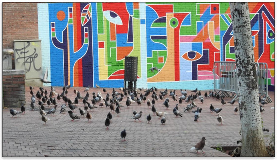 Birds and mammals have been increasingly colonizing cities during recent decades in a process called synurbization [1], but other species, such as the feral pigeon (Columba livia var. domestica), started the process of colonizing the urban environment centuries ago. As other synurbic species in the urban environment, pigeons, due to the lack of predators and the more abundant food resources that are usually present in these environments, have high survival and reproductive rates, which lead to overpopulation and creates the conditions for the rise of human–wildlife interactions and associated conflicts [1,2,3,4]. Public health risks (i.e., Chlamydophila psittaci, Cryptococcus neoformans and Salmonella [3]) and infrastructural damages are the most common conflicts when dealing with a high density of pigeons in urban areas. The homogeneous environmental conditions of the urban ecosystem and the demographic dynamics maintain the stability of the colony’s demographics, unless external factors intervene [5].