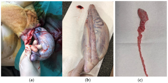 Open castration in a giraffe: (a) Opened processus vaginalis and protruding testis before surgical removal. (b) Giraffe testis, epididymis, and duct deferens. (c) Dissected cauda epididymis and ductus deferens.