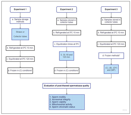 Briefly, sperm was again diluted in a two-step procedure: first, semen was diluted to 400 × 106 spermatozoa/mL with fraction A, and then fraction B was added until achieving a final concentration of spermatozoa (200 × 106 spermatozoa/mL) and glycerol (6%). Both steps took place at room temperature. After dilution, the study was subdivided into three experiments with the following experimental design (Figure 1). Experiment 1 evaluated different storage techniques during sample refrigeration. Experiment 2 examined the effect of different equilibration times, and Experiment 3 determined the effect of several freezing techniques on post-thaw sperm quality.