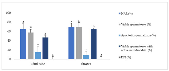 Effects of storage methods during refrigeration of Iberian red deer epididymal sperm samples on spermatozoa quality. Sperm parameters were assessed for two different storage techniques (tubes of 15 mL or 0.25 mL straws) during refrigeration. Data represented as mean ± SEM. NAR—acrosome integrity (%); viable (nonapoptotic) spermatozoa (%); apoptotic spermatozoa (%); viable spermatozoa with active mitochondria (%); DFI—DNA fragmentation index (%). Different letters indicate significant differences between treatments (p ≤ 0.05).