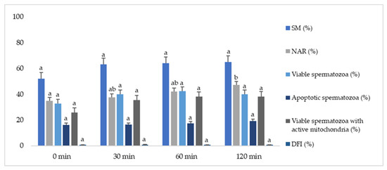 Effect of different equilibration times on the quality of thawed Iberian red deer epididymal spermatozoa. Sperm parameters were assessed for different equilibration times (0, 30, 60, and 120 minutes). Data represented as mean ± SEM. SM—sperm motility index (%); NAR—acrosome integrity (%); viable (nonapoptotic) spermatozoa (%); apoptotic spermatozoa (%); viable spermatozoa with active mitochondria (%); DFI—DNA fragmentation index (%). Different letters indicate significant differences between equilibration times (p ≤ 0.05).