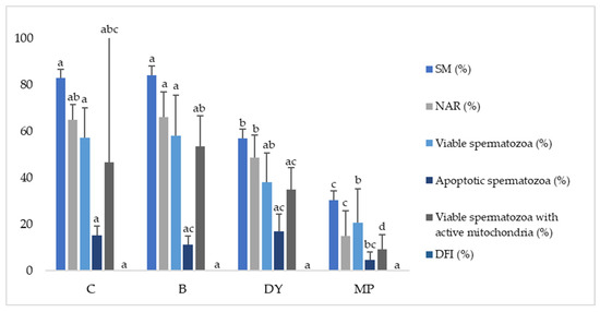 Effect of freezing techniques on post-thaw sperm quality in Iberian red deer epididymal spermatozoa. C (control—liquid nitrogen vapor in a tank), B (box—polystyrene box with liquid nitrogen inside), DY (dry ice—polystyrene box with dry ice inside), and MP (metallic plate—solid metallic plate floating on the surface of liquid nitrogen). Data represented as mean ± SEM. SM—sperm motility (%); NAR—acrosome integrity (%); viable (nonapoptotic) spermatozoa (%); apoptotic spermatozoa (%); viable spermatozoa with active mitochondria (%); DFI—DNA fragmentation index (%). Different letters indicate significant differences between freezing methods (p ≤ 0.05).