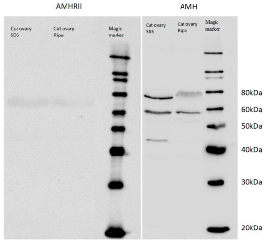 Western blot detection of the AMH protein revealed bands of about 60–80 kDa in the cat ovary samples with the GTX129593 antibody. (Figure 1, Figures S1 and S2) For AMHRII protein, positive bands of different molecular weights (>60 kDa) were seen after incubation with the LS-B11943 antibody.
