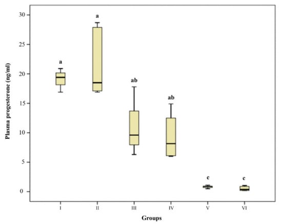 Plasma Progesterone concentration. Box-and-whisker plot. Group I (n = 3, 24–29 days), Group II (n = 8, 32–40 days), Group III (n = 4, 41–46 days), Group IV (n = 6, 53–61 days) Group V (n = 6, interestrus), Group VI (n = 6, estrus). a,b,c p < 0.01.