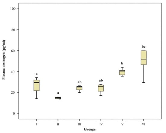 Plasma Estrogen concentration. Box-and-whisker plot. Group I (n = 3, 24–29 days), Group II (n = 8, 32–40 days), Group III (n = 4, 41–46 days), Group IV (n = 6, 53–61 days) Group V (n = 6, interestrus), Group VI (n = 6, estrus). a,b p < 0.05, a,c p < 0.01.