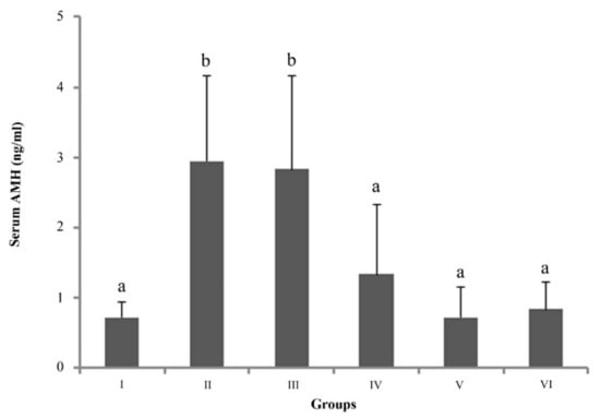 Serum AMH concentration. Group I (n = 3, 24–29 days), Group II (n = 8, 32–40 days), Group III (n = 4, 41–46 days), Group IV (n = 6, 53–61 days), Group V (n = 6, interestrus), Group VI (n = 6, estrus), (mean ± SD).a,b p < 0.05.