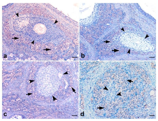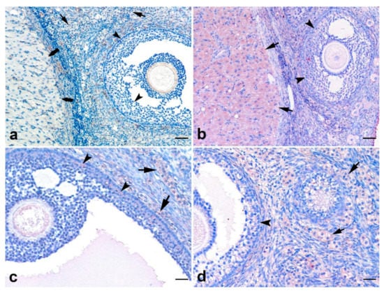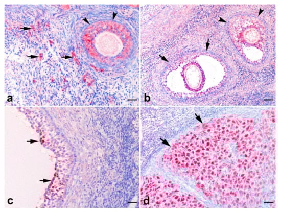 AMH immunopositivity in the feline ovary. (a) AMH immunopositivity in granulosa cells of secondary follicles (arrow heads) and interstitial luteal cells (arrows); (b) AMH immunopositivity in granulosa cells of early antral follicles (arrow heads) and antral follicles (arrows), (c) AMH immunopositivity in mural granulosa cells of large antral follicles (arrows); (d) AMH immunopositivity in luteal cells of corpus luteum (arrows). SABP immunostaining, AEC chromogen, Mayer’s hematoxylin counterstaining, (a,c) ×280 and (b,d) ×140. Scale bar: (a,c) = 30 μM and (b,d) = 60 μM.