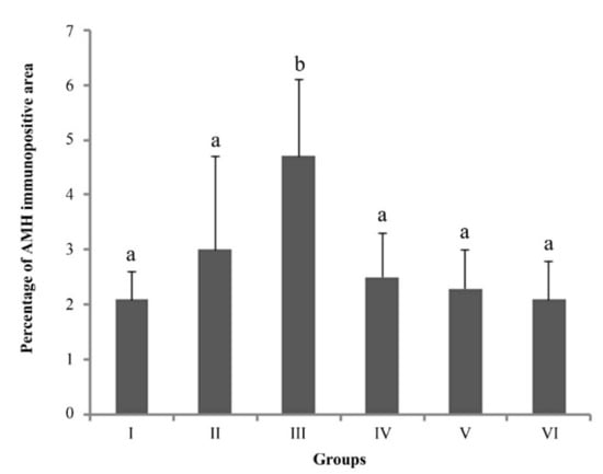 Ovarian AMH expression. Group I (n = 3, 24–29 days), Group II (n = 8, 32–40 days), Group III (n = 4, 41–46 days), Group IV (n = 6, 53–61 days), Group V (n = 6, interestrus), Group VI (n = 6, estrus). a,b p < 0.05.