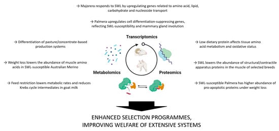 The information obtained from these omics approaches provides a detailed look at the impact of SWL on a molecular level (Figure 1). This allows for a deeper understanding of the metabolic response to weight loss differentiation among adapted and susceptible breeds in two distinguished contexts: dairy and meat production. The identified differences are supported by classical approaches, including mineral, amino acid, and fatty acid profiling. Identifying biomarkers for SWL-resistance enables the improvement of breeding programs for the selection of hardy breeds towards the economic viability and welfare of animals in the extensive production systems in tropical and Mediterranean regions.
