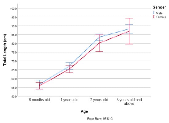 A total of 282 samples, where 59.22% of male and 40.78% of female rescued pangolins were accounted for in this study. The maximum total length and bodyweight of the species were 114.9 cm and 7566 g, respectively. The average ratio of total length and tail length of the Chinese pangolin was 1.7 (SD = 0.4). Pangolins older than one year (n = 123, 43.6%) were rescued and rehabilitated, followed by 6 month old pangolins (n = 82, 29.1%), while the adult pangolins were 2 years old (n = 42, 14.9%), and 3 years old and above (n = 35, 12.4%). The total length increase was statistically significant different between ages (F = 192.3, df = 3, p = 0.000) (Figure 1, Supplementary Table S1).