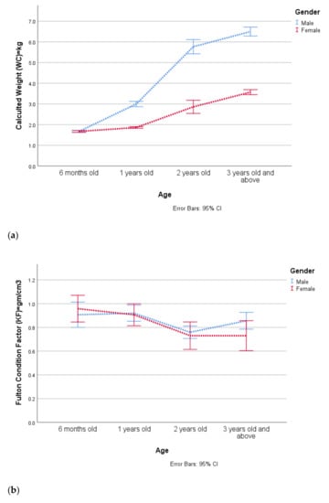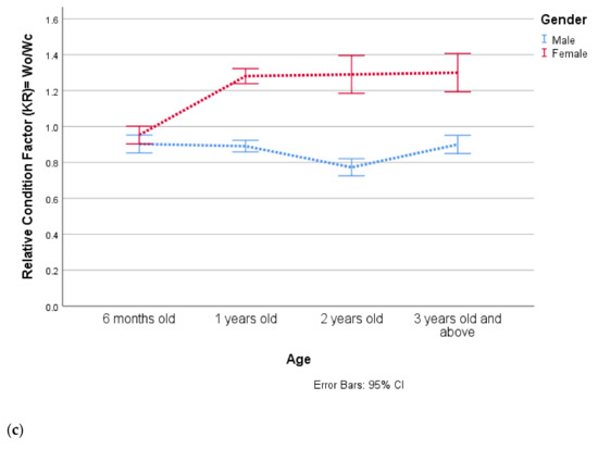 Age-wise (a) calculated weight and condition factors; (b) Fultion condition factor and (c) relative condition factor of Chinese pangolins.