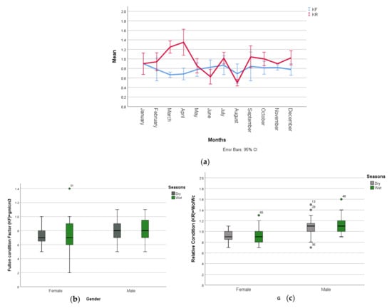 The variation of Fulton condition factor and realative condition factor in different (a) months and (b,c) seasons in adult Chinese pangolins.