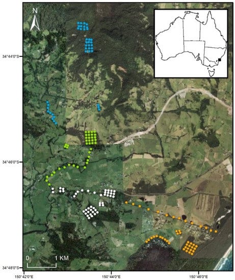 - Malekian, M.; Cooper, S.J.B.; Saint, K.M.; Lancaster, M.L.; Taylor, A.C.; Carthew, S.M. Effects of landscape matrix on population connectivity of an arboreal mammal, Petaurus breviceps. Ecol. Evol. 2015, 5, 3939–3953. [Google Scholar] [CrossRef]