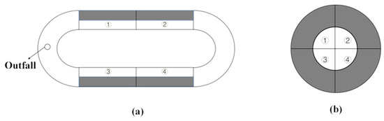 Different experimental devices for different development stages of Eriocheir sinensis ((a): the experimental device of parent crabs; (b): the experimental devices of juvenile and button-sized crabs). The numbers 1–4 represented four experimental areas including black areas and blank areas. Four black areas represented the location of four kinds of shelters respectively.