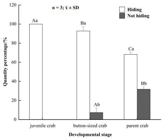 The hiding rate was 100% for juvenile crabs, and the hiding rate was (92.71 ± 4.77)% for button-sized crabs, showing a significant difference between juvenile and button-sized crabs (Figure 2). For parent crabs, the hiding rate (68.23 ± 2.39)% indicated a significant difference between hiding and not hiding (Figure 2). Therefore, the concealing behavior of juvenile crabs was the most significant, followed by button-sized and parent crabs.