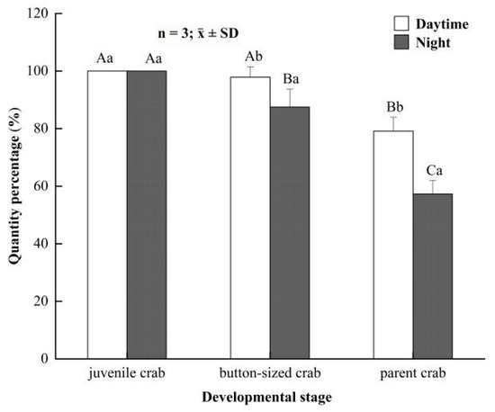 For juvenile crabs, the hiding rate (100%) showed no significant difference between night and daytime (Figure 3). In daytime, the hiding rate of button-sized crabs was (97.92 ± 3.61)%, which was significantly higher than that at night (p < 0.05). Parent crabs yielded analogous results in our study. The hiding rate was (79.17 ± 4.77)% in daytime, which was also significantly higher than that at night (57.29 ± 4.77)%.