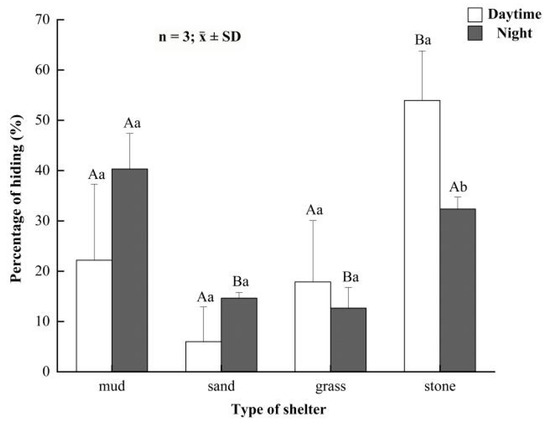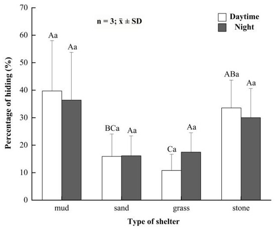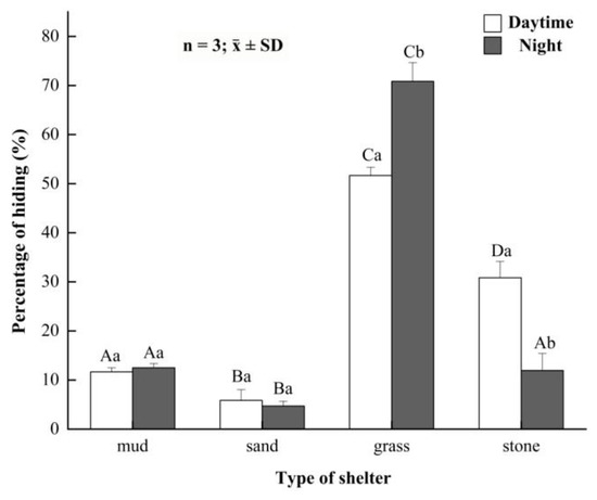The hiding rate of button-sized Eriocheir sinensis in different shelters between daytime and night. Bars with same letters on the top indicate they have insignificant differences (p > 0.05), and bars with different letters on the top indicate they have significant differences (p < 0.05). Capital letters indicate the significance of hiding rates in different developmental stages, and lowercase letters indicate the significance of hiding and not hiding in the same stage.