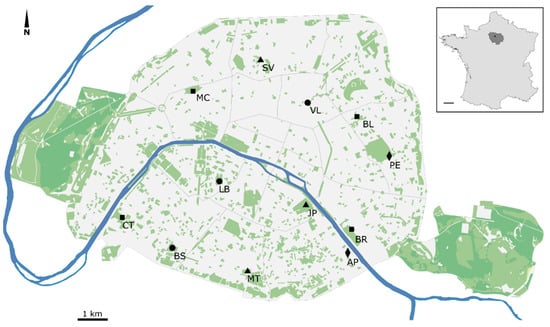 This inventory of pollinator species was conducted in the city of Paris, one of the most densely populated cities in the world []. Paris covers 105.4 km² and is part of the Ile-de-France administrative region (12,012 km²). Insect collection was carried out in 12 green spaces of different sizes (vegetated areas ranging from 2960 to 116,102 m2) evenly distributed throughout the city (Figure 1). These 12 green spaces were integrated into a dense urban matrix, characterized by a high proportion of impervious surfaces (70 to 90% within a 1-km radius) []. They had various management practices, but were always free of pesticides. They were classified into four categories: (1) restricted areas, intended to serve as biodiversity reservoirs (MT, SV, JP), managed using ecological practices (no intensive mowing, little pruning, no weeding, only native plant species); (2) small parks open to the public, maintained using the same ecological practices as above, and combining several vegetation layers (AP, PE); (3) large parks with differentiated management including dedicated refuge spaces to accommodate biodiversity (BL, CT, MC, BR); (4) classical gardens with a predominantly ornamental style (preference for horticultural plants and frequent weeding) (BS, LB, VL). The 12 green spaces are managed by diverse stakeholders (for the most part the Paris City Council) and have different histories: some are large historical parks that have undergone transformations over the centuries (MC, JP); other former convents or private mansions (VL, LB, ST); though most are recent parks built on formerly residential or industrial land (AP, BL, BR, BS, CT, PE). MT is located above a buried hydraulic structure dating from 1873. These different histories and management practices appear to result in contrasting herbaceous floral diversity. This and more detailed information on the green spaces surveyed can be found in Appendix A Table A1.