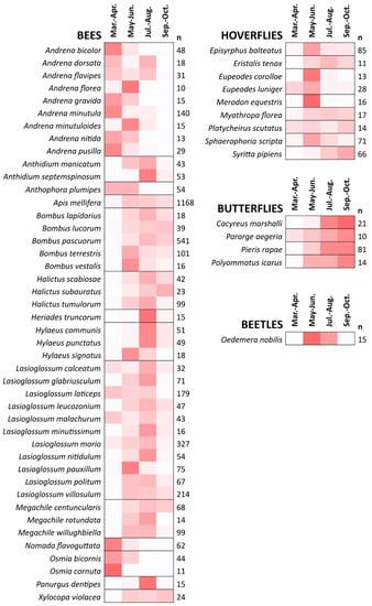 Seasonal distribution of insect occurrence in all twelve green spaces and both years combined. The color intensity gradient represents the distribution of catches for each species over the study period, which is divided into two-month intervals (redder means more catches). Only bee, hoverfly, butterfly, and beetle species collected in large numbers are represented (total number of individuals per species n ≥ 10).