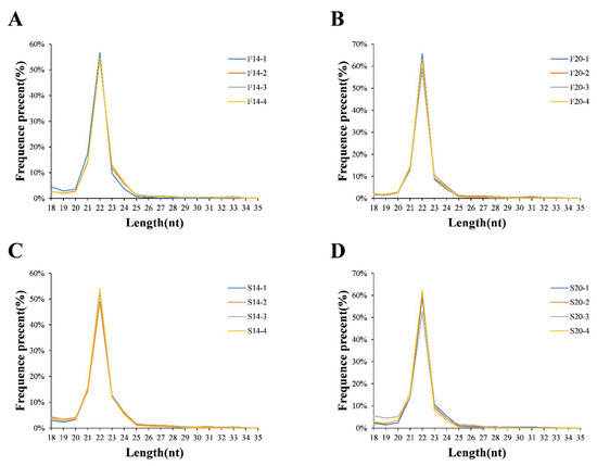 Distribution of length for miRNAs. (A) Distribution of length for miRNAs in F14; (B) distribution of length for miRNAs in F20; (C) distribution of length for miRNAs in S14; (D) distribution of length for miRNAs in S20.