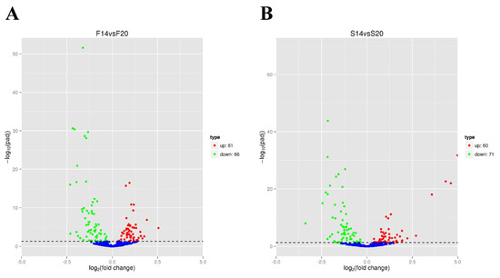 Volcano plot of differentially expressed miRNAs (DEMs). (A) Volcano plot of F14 vs. F20 comparison group; (B) volcano plot of S14 vs. S20 comparison group.