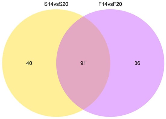 In the F14 vs. F20 comparison group, 127 DEMs were screened, with 61 upregulated and 66 downregulated (Figure 2A, Table S2). In the S14 vs. S20 comparison group, 131 DEMs were screened, with 60 upregulated and 71 downregulated (Figure 2B, Table S3). In both comparison groups, 91 DEMs were common, indicating that these DEMs play important roles in the development of skeletal muscle of both fast-growing and slow-growing Bian chickens (Figure 3). Cluster analysis showed that the DEMs had different expression patterns in the F14 vs. F20 and S14 vs. S20 groups, and four individuals in each group had excellent reproducibility (Figure 4).