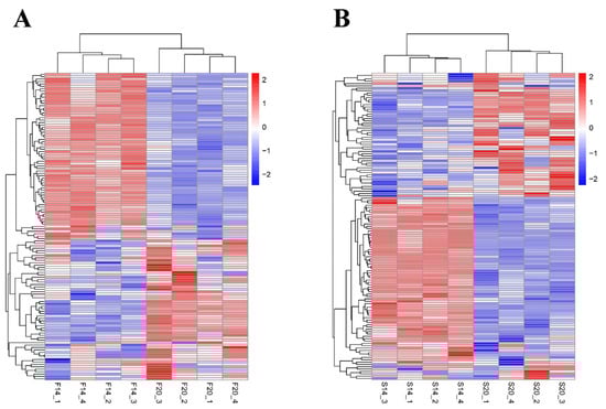 Cluster analysis of DEMs. (A) Cluster analysis of F14 vs. F20 comparison group; (B) cluster analysis of S14 vs. S20 comparison groups.