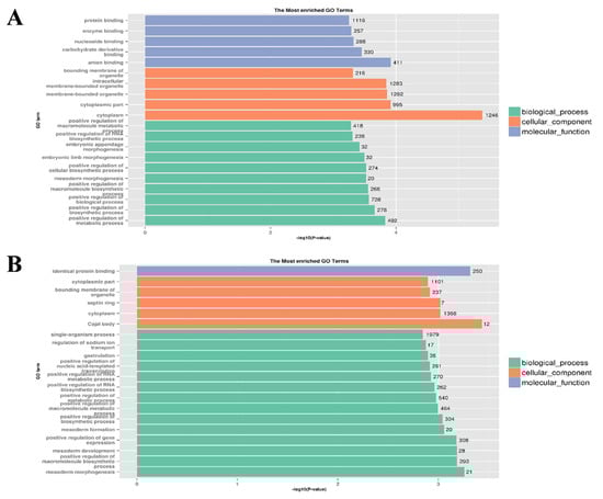 The top 20 GO terms of predicted target genes. (A) The top 20 GO terms in F14 vs. F20 comparison group; (B) the top 20 GO terms in S14 vs. S20 comparison group.