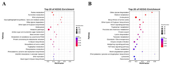 The top 20 KEGG pathways of predicted target genes. (A) The top 20 KEGG pathways in F14 vs. F20 comparison group; (B) the top 20 KEGG pathways in S14 vs. S20 comparison group.
