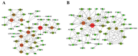 According to the connectivity degree with predicted target genes, the top 10 DEMs were screened in the fast-growing and slow-growing groups. There were five DEMs common to both groups (gga-miR-146a-3p, gga-miR-2954, gga-miR-34a-5p, gga-miR-1625-5p, gga-miR-18b-3p). Notably, the connectivity degrees of these five DEMs ranked in the top five of the fast-growing group. In order to further explore the key DEMs and predicted target genes, we performed an interaction network analysis of genes enriched in KEGG pathways associated with muscle growth and development. The interaction network is shown in Figure 7. The analysis showed that a total of 50 genes participated in the construction of the interaction network in the fast-growing group, and the connectivity degree of HSPA5, NOTCH1, PKM2 and NOTCH2 was the highest. For the slow-growing group, the interaction network consisted of 46 genes, with NOTCH1, NOTCH2 and RBPJ having the highest connectivity degree. The prediction results showed that HSPA5 and RBPJ were the targets of gga-let-7g-3p and gga-miR-1677-3p, respectively. PKM2 was the target of gga-miR-490-3p and gga-miR-6660-3p. NOTCH1 was the target of gga-miR-12223-5p in the fast-growing group and novel-miR-327 in the slow-growing group, and NOTCH2 was the target of gga-miR-18a-5p, gga-miR-18b-5p and gga-miR-34a-5p in both groups.