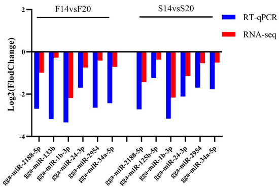 Seven DEMs from the F14 vs. F20 and S14 vs. S20 comparison groups were verified for RT-qPCR. The results of qPCR and RNA-seq showed a consistent expression trend, which further demonstrated the accuracy of RNA-seq data (Figure 8).