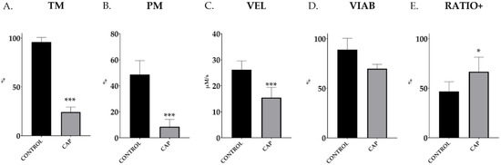 Total motility (TM), progressive motility (PM), velocity (VEL), membrane integrity (VIAB) and ratio of capacitated taking into account only the viable sperm (RATIO+) in control (CONTROL) and in vitro capacitated (CAP) boar ejaculated spermatozoa (n = 5). The results are shown as mean ± SEM. * depicts significant differences between CONTROL and CAP (* p < 0.05; *** p < 0.001).