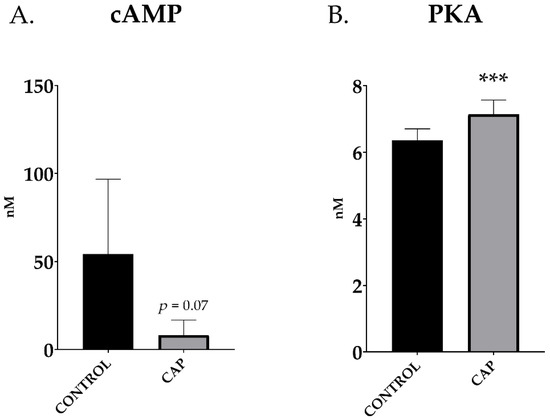 Capacitated boar samples tend to lower its intracellular cAMP levels compared to control doses (54.2 ± 15.9 vs. 8.2 ± 3.2 nM; CONTROL vs. CAP; p > 0.05) although without significant differences (p = 0.07; Figure 2A). On the contrary, PKA increased in the sperm doses subjected to 30 min of capacitation; in this case, it increased significantly (6.36 ± 0.13 vs. 7.14 ± 0.16 nM/mL; CONTROL vs. CAP, p < 0.001; Figure 2B).