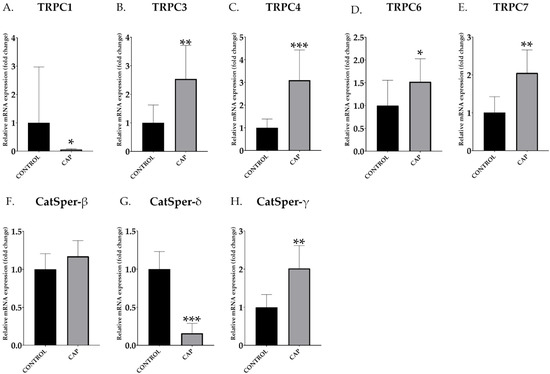 TRPC (Figure 3A–E) and CatSper (Figure 3F–H) mRNA abundance data were obtained after qPCR. An increase in the relative abundance of mRNA transcript of TRPCs was observed in the in vitro capacitated boar spermatozoa (CAP) compared to the control samples (CONTROL) in most of the studied genes: TRPC3 (CONTROL: 1.00 ± 0.57 vs. CAP: 2.54 ± 1.08; Figure 3B), TRPC4 (CONTROL: 1.00 ± 0.35 vs. CAP: 3.09 ± 1.22; Figure 3C), TRPC6 (CONTROL: 1.00 ± 0.51 vs. CAP: 1.52 ± 0.46; Figure 3D) and TRPC7 (CONTROL: 1.00 ± 0.39 vs. CAP: 2.05 ± 0.55; Figure 3E); and CatSper-γ (CONTROL: 1.00 ± 0.27 vs. CAP: 2.43 ± 0.43; Figure 3H). TRPC1 (CONTROL: 1.00 ± 0.80 vs. CAP: 0.06 ± 0.01; Figure 3A) and Catsper-δ (CONTROL: 1.00 ± 0.21 vs. CAP: 0.39 ± 0.16; Figure 3G) showed a significant decrease (p < 0.05) in the relative abundance of mRNA transcript in capacitated spermatozoa (p < 0.05). CatSper-β relative abundance increased in capacitated sperm compared to the control, although without significant differences (CONTROL: 1.00 ± 0.19 vs. CAP: 1.17 ± 0.19; Figure 3F).