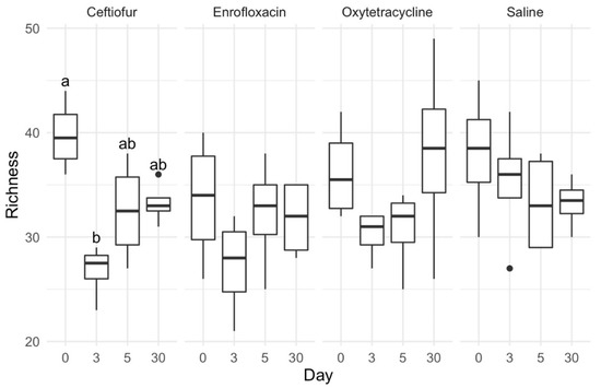 Boxplots of operational taxonomic unit richness throughout treatment duration. Richness was calculated as the total number of genera present in each sample. Data presented as median and interquartile range (IQR). Whiskers are 1.5 × IQR and data outside the whiskers are shown as outliers (black circles). Different letters within a treatment panel indicate significant differences (p < 0.05).