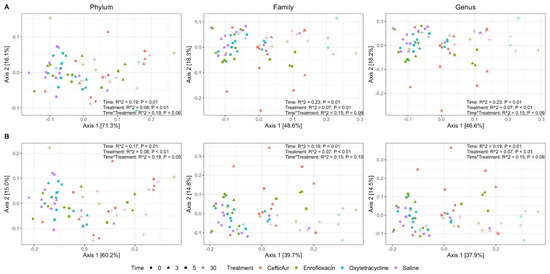 Principal coordinate analysis on Bray-Curtis and Jaccard distances. Distance metrics by panel row are (A) Bray-Curtis and (B) Jaccard. Samples are colored by treatment and shaped by day. Figure panels in each column are grouped to the displayed taxonomic level. Text within each panel represents the results of PERMANOVA testing against time, treatment and their interactions.
