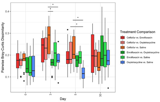 Microbial composition was significantly different (p < 0.05) across treatment group and day, but not for interactions between treatment and day, regardless of taxonomic level and beta-diversity distance metric (Figure 2A,B). Bray-Curtis distances consistently captured more variation in microbial composition compared to Jaccard distances, regardless of taxonomic level analyzed (Figure 2A,B). At the family and genus-level, PERMANOVA R2 estimates for Bray-Curtis distances indicated that day and day-treatment interactions explain 23% and 15% of variation in microbial composition, respectively (Figure 2A). Principal coordinate analysis showed signs of clustering at genus-level grouping for Bray-Curtis distances in which enrofloxacin, oxytetracycline and saline samples at days 0, 3 and 5 cluster together (Figure 2A). Samples from day 30 clustered together, but clustering was not observed for the remaining treatment groups (Figure 2A). Pairwise Bray-Curtis differences only identified significant differences in microbial composition between treatments on day 3 and day 5 (Figure 3). On day 3, the microbial composition of saline treated animals was significantly more similar (p < 0.05) to oxytetracycline and enrofloxacin treated groups compared to ceftiofur (Figure 3). On day 5, saline treated animals were only significantly more similar (p < 0.05) to oxytetracycline than to ceftiofur treated horses (Figure 3).