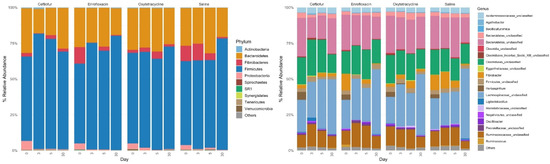 Microbial relative abundances for each treatment group by day. Bacteria were either grouped at phylum or genus level taxonomy. Only top 10 relatively abundant phyla and top 20 relatively abundant genera are shown.