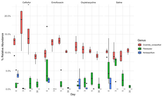 Four main phyla were highly prevalent throughout all treatment groups, Firmicutes, Bacteroidetes, Fibrobacteres and Proteobacteria, with all other phyla being present at <1% relative abundance (Figure 4). In ceftiofur and enrofloxacin treatment groups, relative abundance of Fibrobacteres was lower on day 3 compared to other days measured (Figure 4). At genus level taxonomy, larger differences in microbial population dynamics become apparent during treatment progression. Relative abundance of an unclassified genus of the phylum Bacteroidetes remains relatively constant throughout treatment progression, except for ceftiofur, in which relative abundance decreased on days 3 and 5 (Figure 4). Relative abundance of an unclassified genus of the family Lachnospiraceae increased on day 3 for all treatments except saline, where this taxon remained consistently low before increasing on day 30 (Figure 4). Herbaspirillum was highly abundant on day 0, before lowering to <1% relative abundance for all treatment groups during the study period (Figure 5). Clostridia populations increased in relative abundance from day 0 to days 3 and 5 for ceftiofur and enrofloxacin treated groups, before returning to baseline levels by day 30 (Figure 5). Clostridia relative abundance did not appear to vary by day for oxytetracycline and saline groups (Figure 5). Fibrobacter slowly decreased over the 30-day period for saline and oxytetracycline treated groups but lowered to <1% relative abundance in ceftiofur and enrofloxacin treated groups by day 3 (Figure 5).