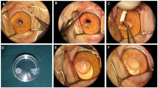 All operations were performed with the aid of an operating microscope (CORELLA XY/FS1-12, Moeller, Wedel, Germany). Briefly, the size of the lesion was measured with calipers under the operating microscope, and then a trephine 0.25 mm larger than the diameter of the lesion was selected to perform lamellar keratotomy (Figure 1A,B). A crescent blade (Mani Inc., TOCHIGI, Japan) was used to perform lamellar dissection until the lesion was completely removed (Figure 1C). Depending on the thickness of the corneal excised stroma, an applicable size of sterile BioCorneaVetTM (Sanhe PetsEyes Pets Foods & Products Co., Ltd., Langfang, China) was applied (200, 300, 400, or 450 microns were used in this study) (Figure 1D). Following the manufacturer’s instructions, the BioCorneaVetTM was rehydrated with normal saline for 10 s, no longer than 30 s, and then a matching graft was obtained by cutting with a trephine 0.25 mm larger than the corneal defect (Figure 1E). The graft was sutured into the implant bed using an interrupted suture with 9/0 absorbable polyglycolic (USIOL Inc., Lexington, KY, USA), or a 10/0 non-absorbable nylon (Mani Inc., TOCHIGI, Japan) suture in some cases in order to strengthen the fixation (Figure 1F). During the operation, irrigation of the ocular surface with balanced salt solution was performed to prevent excessive desiccation of the cornea, but less frequently than usual, so as not to accelerate the edema of the graft. For the cases with simultaneous entropion, the correction of entropion was performed with modified Hotz–Celsus procedure first. The corneal erosion was cleaned and debrided with a sterile cotton swab, and the bullous lesions were treated with thermoplasty. OCT examination was performed again immediately after the operation to evaluate the implant status. Subjects were advised to wear an Elizabethan collar for a minimum of 2 weeks after surgery.