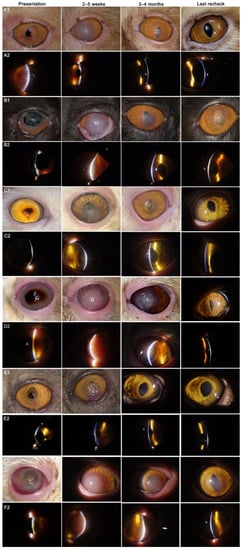 Post-operative examinations of all cats were performed at 1, 2, 3, 4, 5, 6, 7, and 8 weeks, and then at 3-, 6-, and 12-months after surgery. In some cases, the frequency of post-op examination was much higher because of requests from the owners. A complete ophthalmic examination was performed including dazzle reflex, menace response, STT I, intraocular pressure measurement, fluorescein staining, slit-lamp biomicroscopy, and indirect ophthalmoscopy. In addition, OCT was performed at 3-, 6-, and 12-months post-surgery to evaluate the structure and morphology of the grafts and corneas. A postoperative vision evaluation system by Chow et al., 2016 [], was used in this study, illustrating that cases were divided into five categories, based on the presence of corneal blood vessels, the opacity of the corneal scar, the positive menace response, the ability to visualize the posterior and/or the anterior segment through the grafted area at their last examination, and the time period from the surgery to the last examination was at least 3 months. Questionnaires were completed with 60 owners to evaluate satisfaction with the outcome of the surgery.